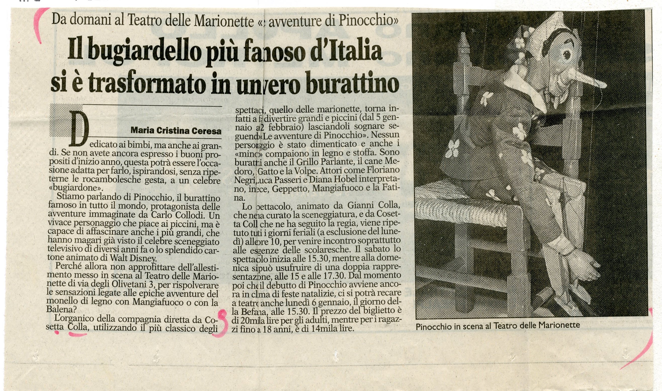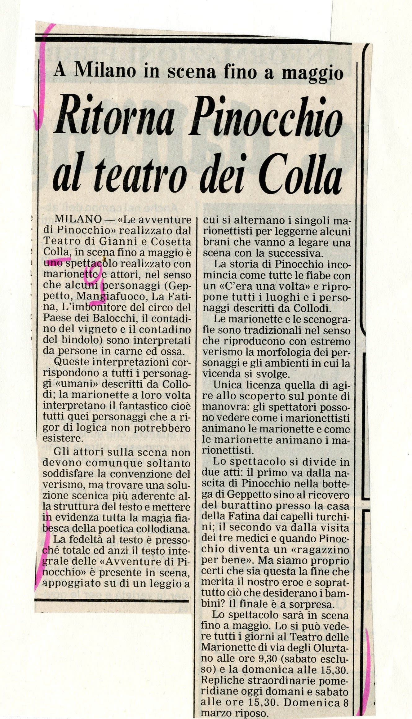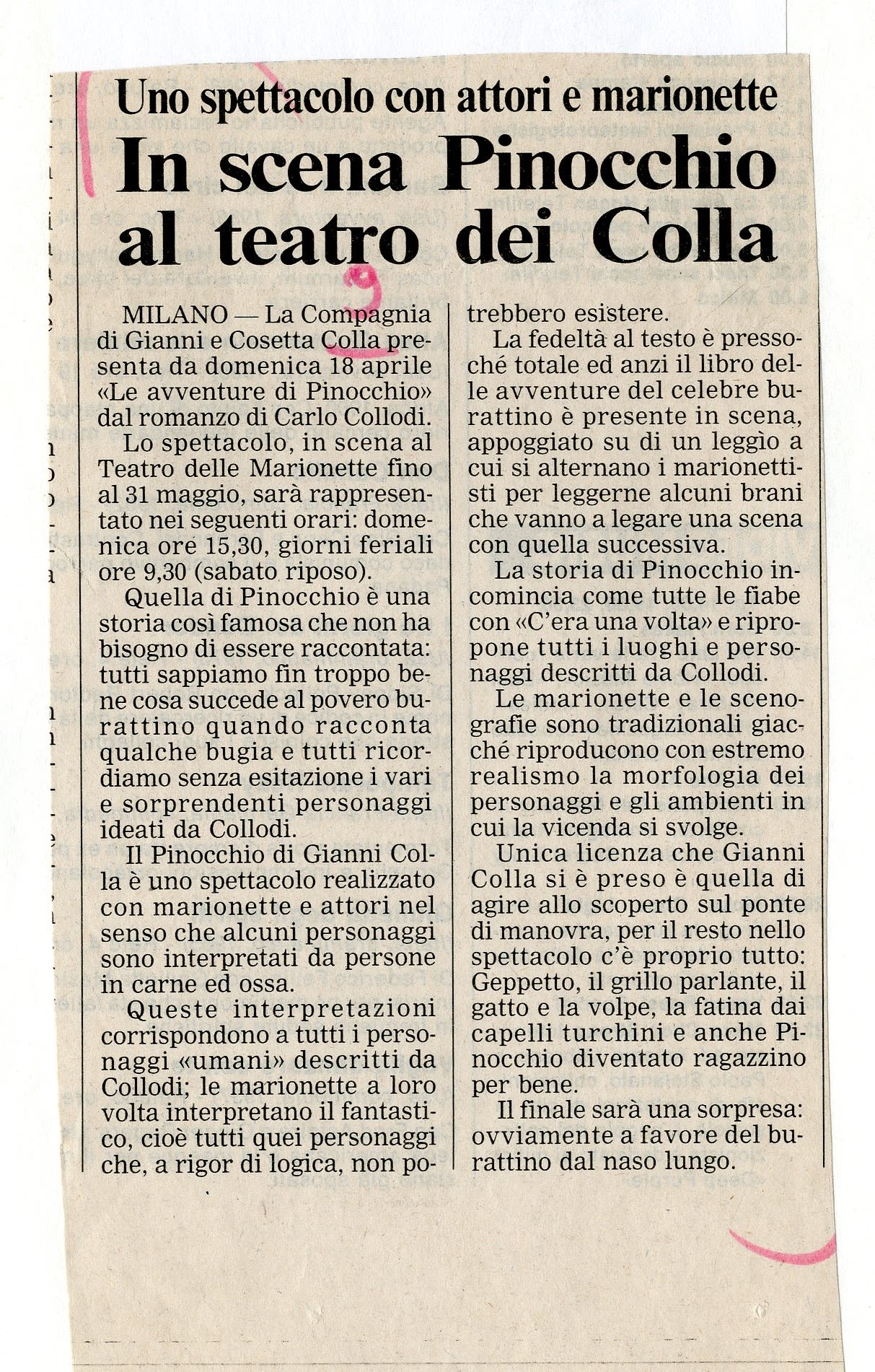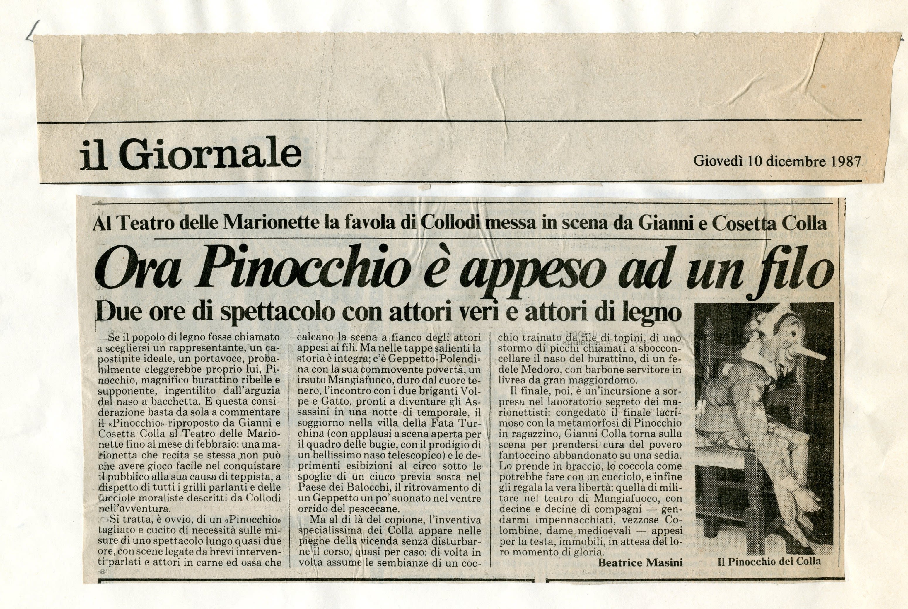 "Se il popolo di legno fosse chiamato a scegliersi un rappresentante , un capostipite ideale, un portavoce, probabilmente elegerebbe proprio lui. Pinocchio, magnifico burattino ribelle e supponente, ingentilito dall'arguzia del naso a bacchetta. E questa considerazione basta da sola per commentare il Pinocchio riproposto da Gianni e Cosetta Colla al Teatro delle Marionette. Gianni Colla torna sulla scena per prendersi cura del povero fantoccino abbandonato su una sedia. Lo prende in braccio, lo coccola, come potrebbe fare con un cucciolo, e infine gli regala la vera libertà: quella di militare nel teatro". (Beatrice Masini)