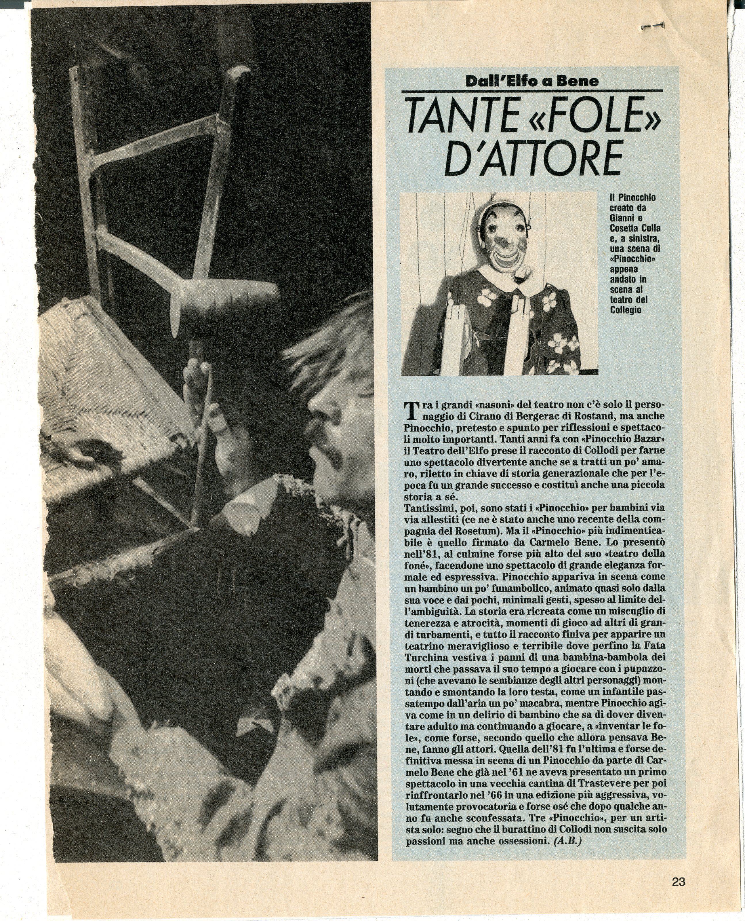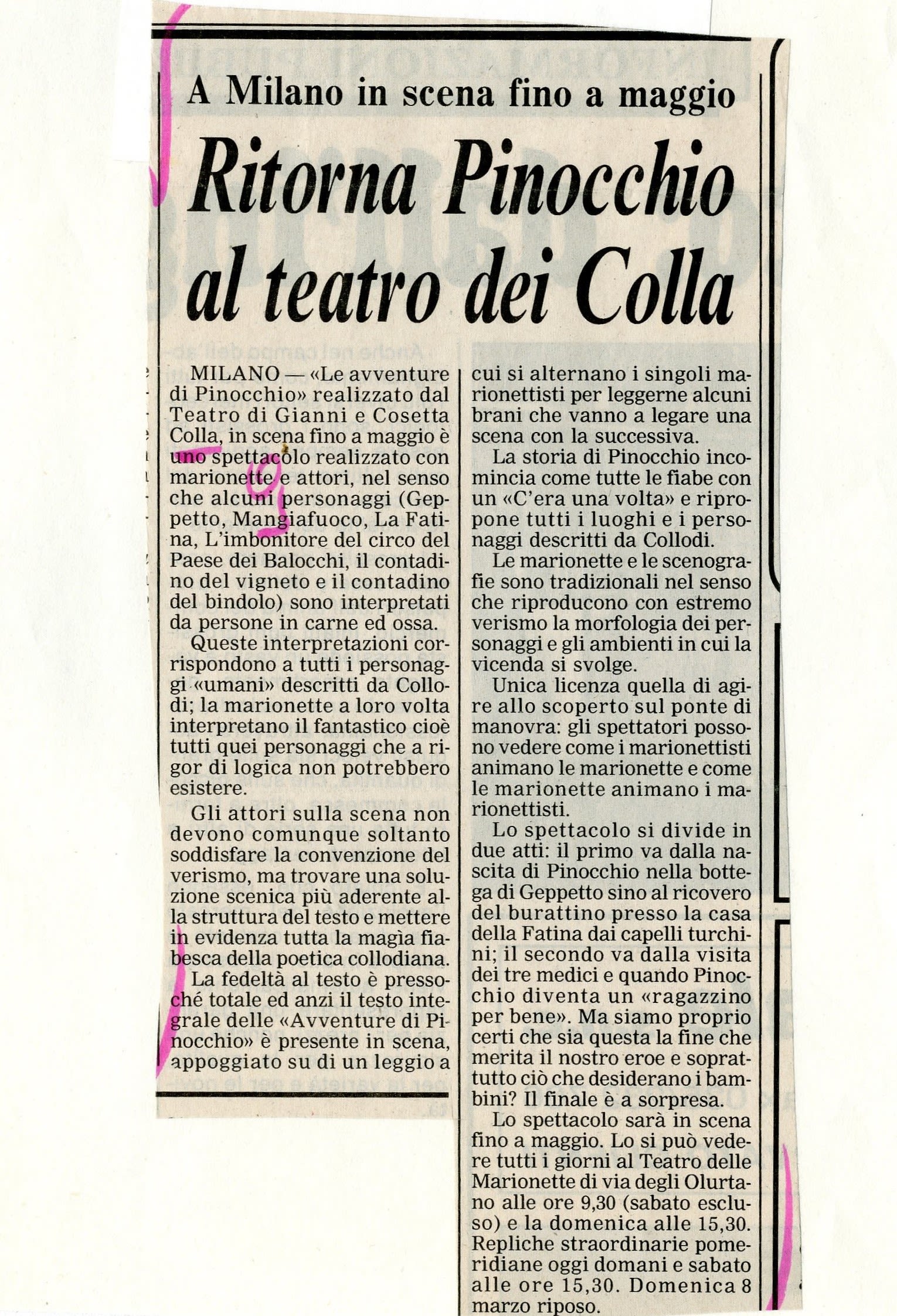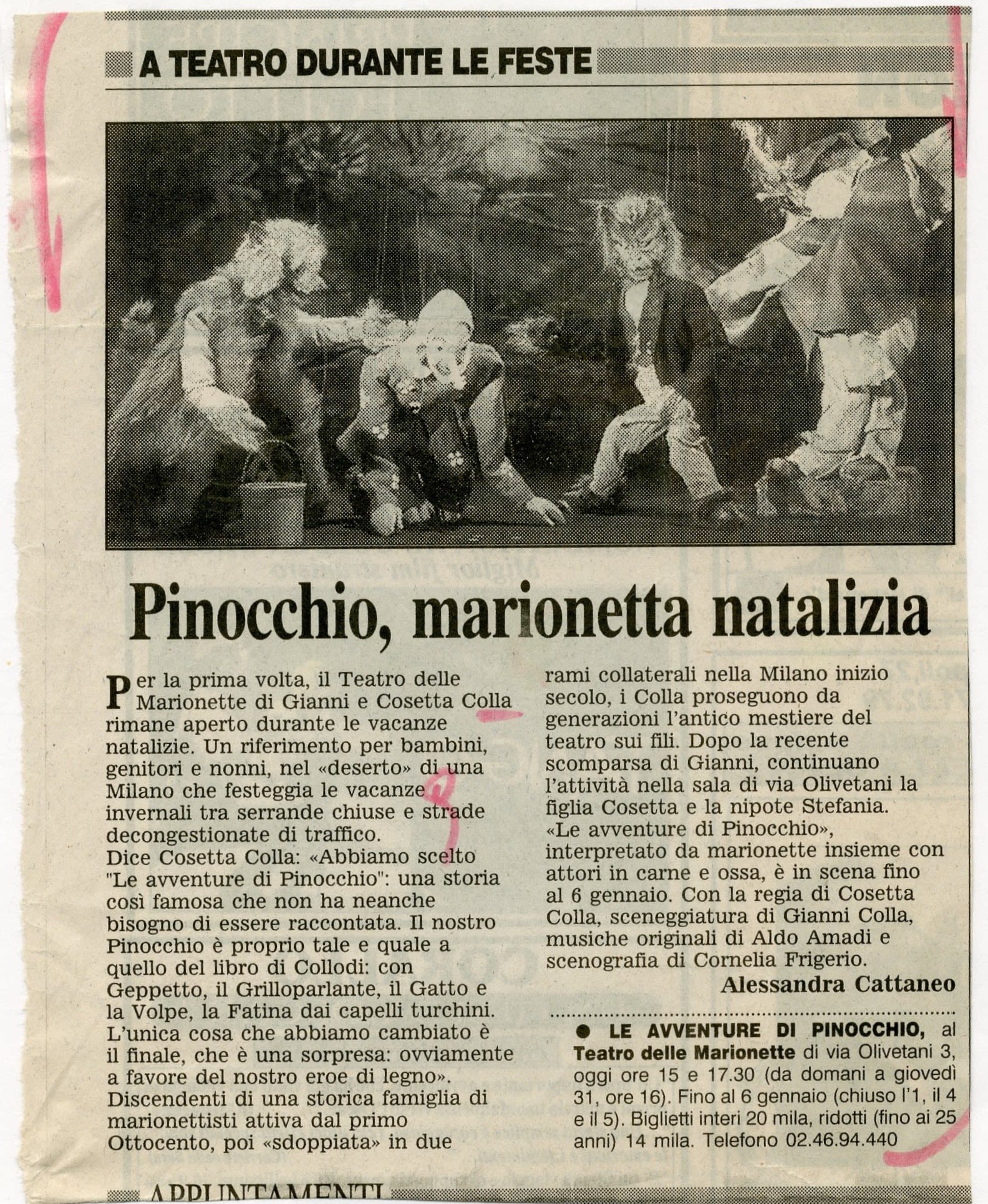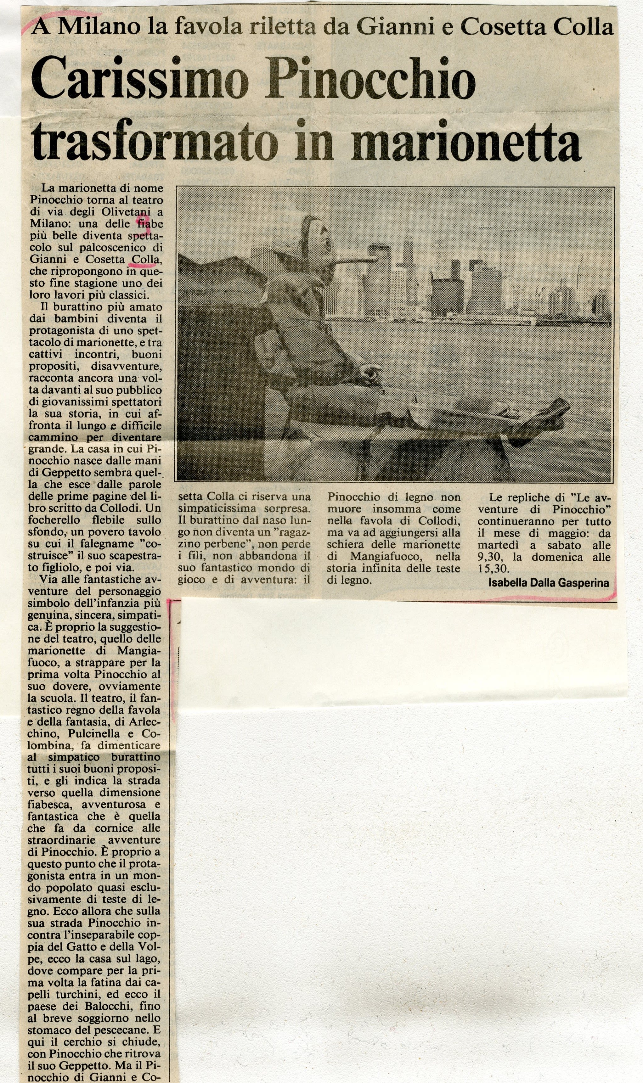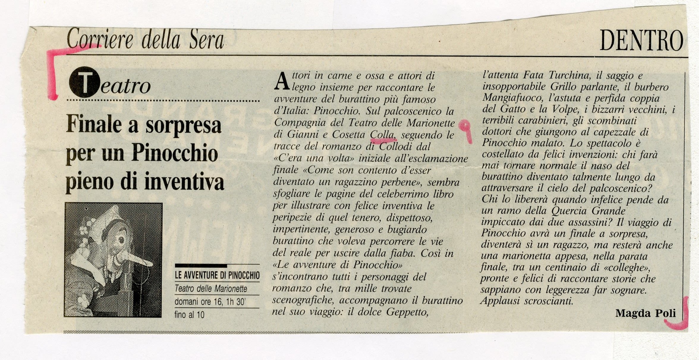 "Se il popolo di legno fosse chiamato a scegliersi un rappresentante , un capostipite ideale, un portavoce, probabilmente elegerebbe proprio lui. Pinocchio, magnifico burattino ribelle e supponente, ingentilito dall'arguzia del naso a bacchetta. E questa considerazione basta da sola per commentare il Pinocchio riproposto da Gianni e Cosetta Colla al Teatro delle Marionette. Gianni Colla torna sulla scena per prendersi cura del povero fantoccino abbandonato su una sedia. Lo prende in braccio, lo coccola, come potrebbe fare con un cucciolo, e infine gli regala la vera libertà: quella di militare nel teatro". (Beatrice Masini)