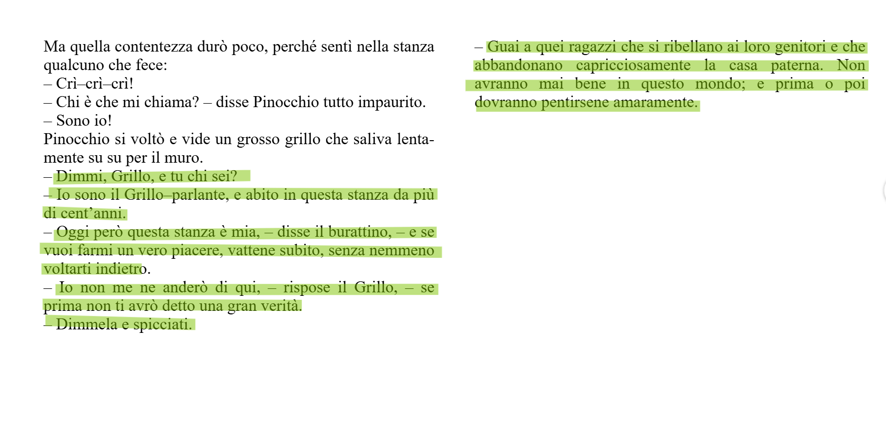 Canta pure Grillaccio, ma se io non mi ribello mi manderanno a scuola, e io a dirtelo in confidenza, di studiare, non ne ho punto voglia.