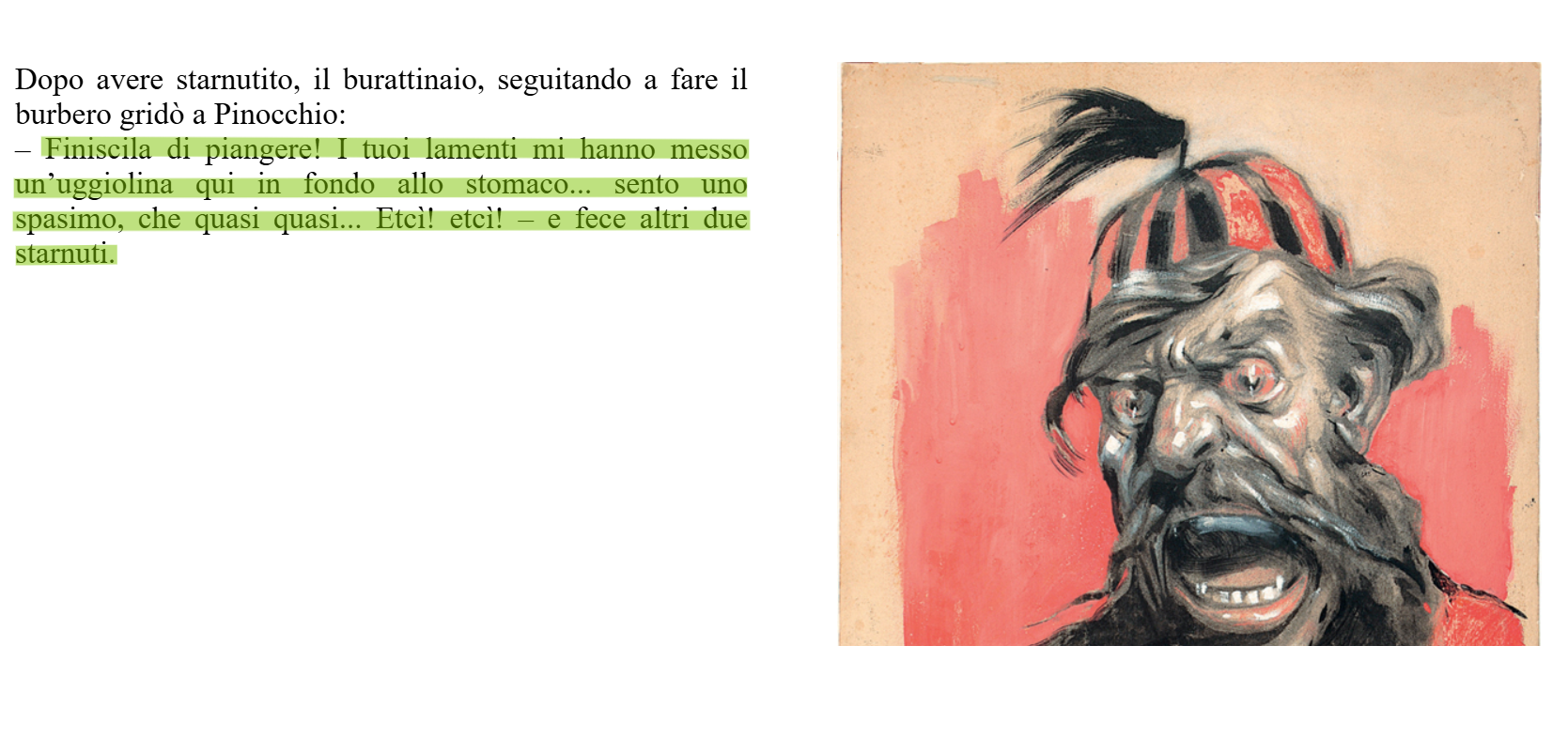 PINOCCHIO: Gli andò che il sig. Mangiafuoco mi regalò alcune monete e mentre mi affrettavo a portarle al mio babbo, gli assassini tentarono di rubarmele.