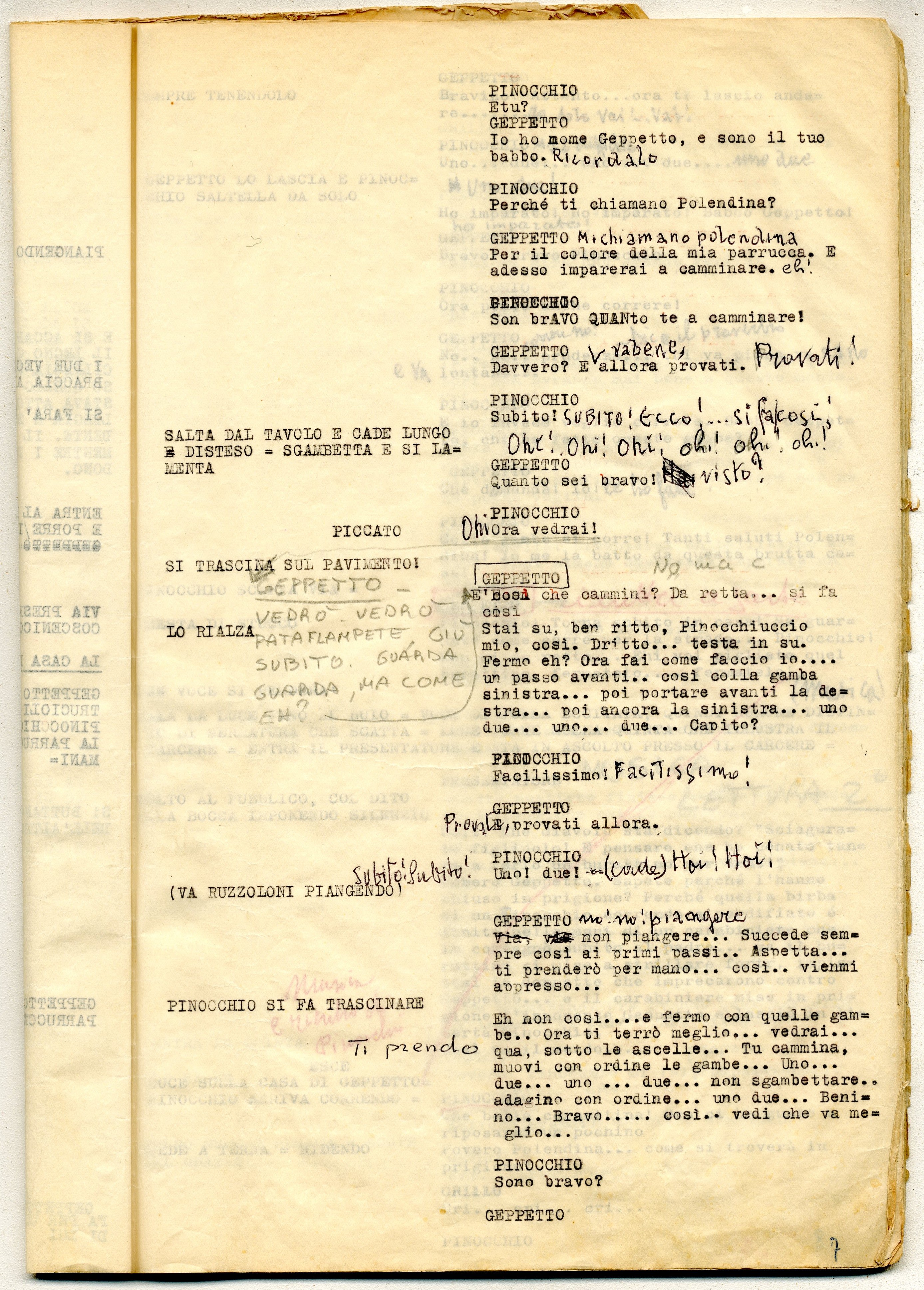 GEPPETTO: Ah è così che cammini? Da' retta... si fa così. Stai su ben dritto Pinocchiuccio, testa in su. Fermo eh? Fai come faccio io... un passo avanti così con la gamba sinistra... poi portare avanti la destra... poi ancora la sinistra, uno... due.. uno... due.. Capito?