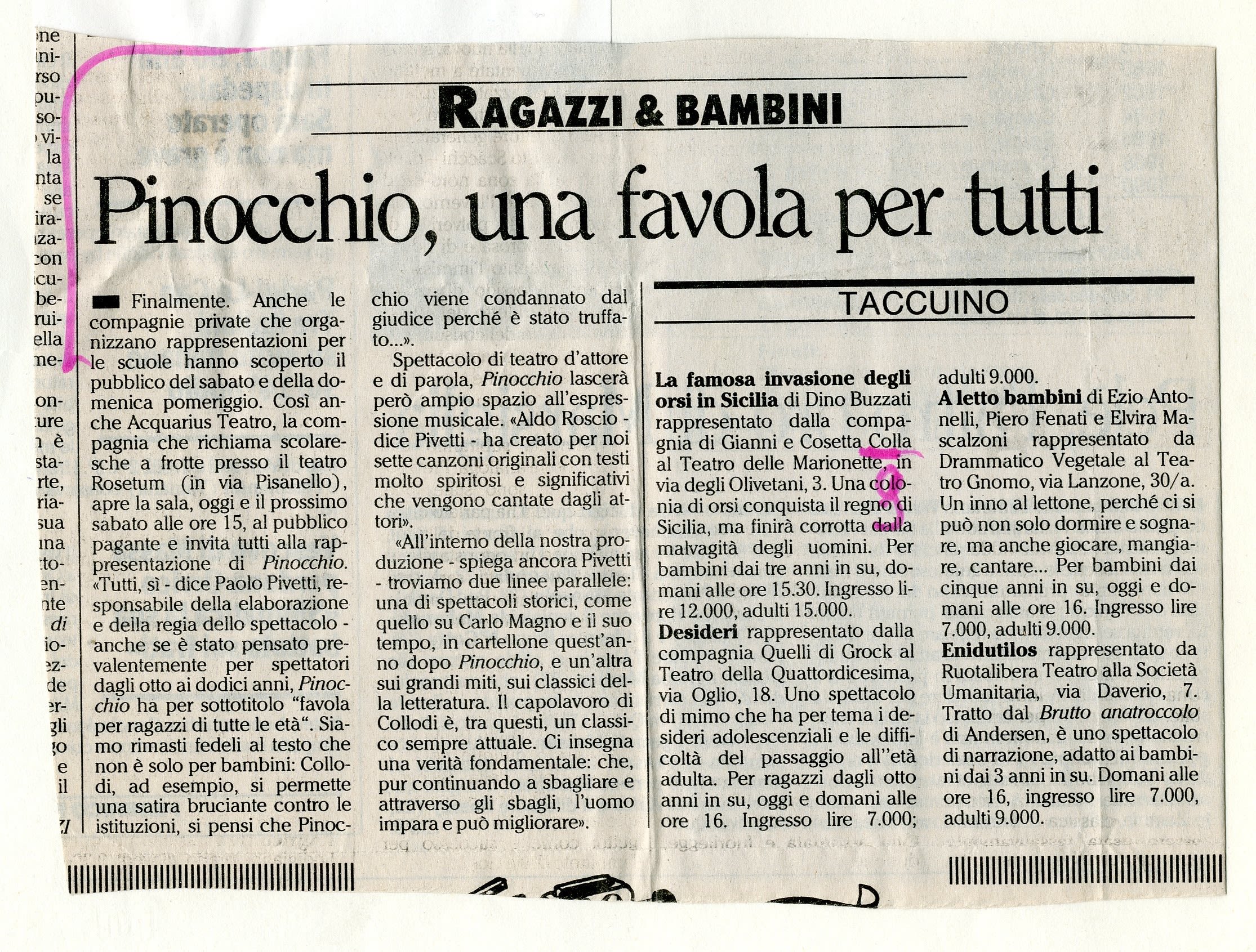 Pinocchio ha per sottotitolo "favole per ragazzi di tutte le età". Collodi ad esempio si permette una satira bruciante delle istituzioni, si pensi che Pinocchio viene condannato dal giudice perchè è stato truffato. Spettacolo di attore e di parole, Pinocchio lascerà spazio all'espressione musicale. Aldo Roscio ha creato per noi sette canzoni originali con testi molto spiritosi e significativi.